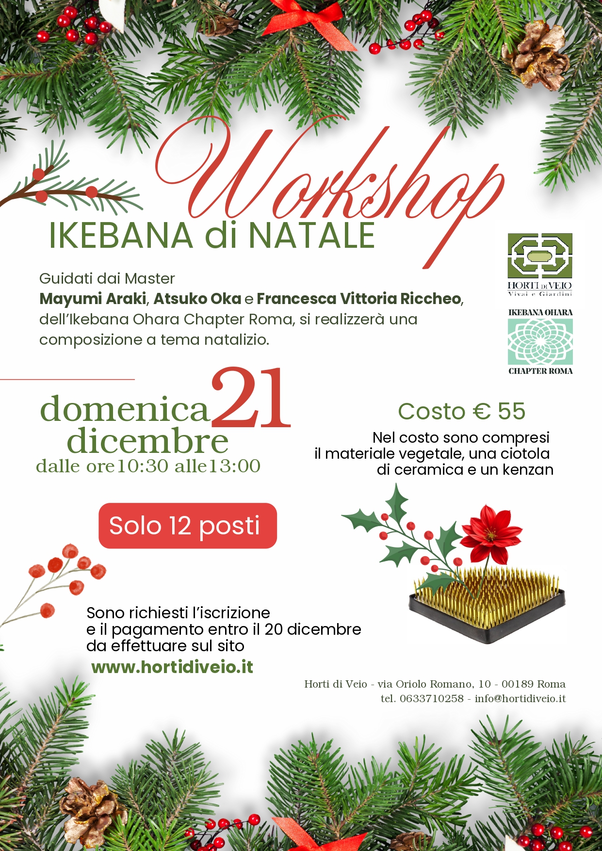 Guidati dai Master Mayumi Araki, Atsuko Oka e Francesca Vittoria Riccheo, dell’Ikebana Ohara Chapter Roma, si realizzerà una composizione a tema natalizio.